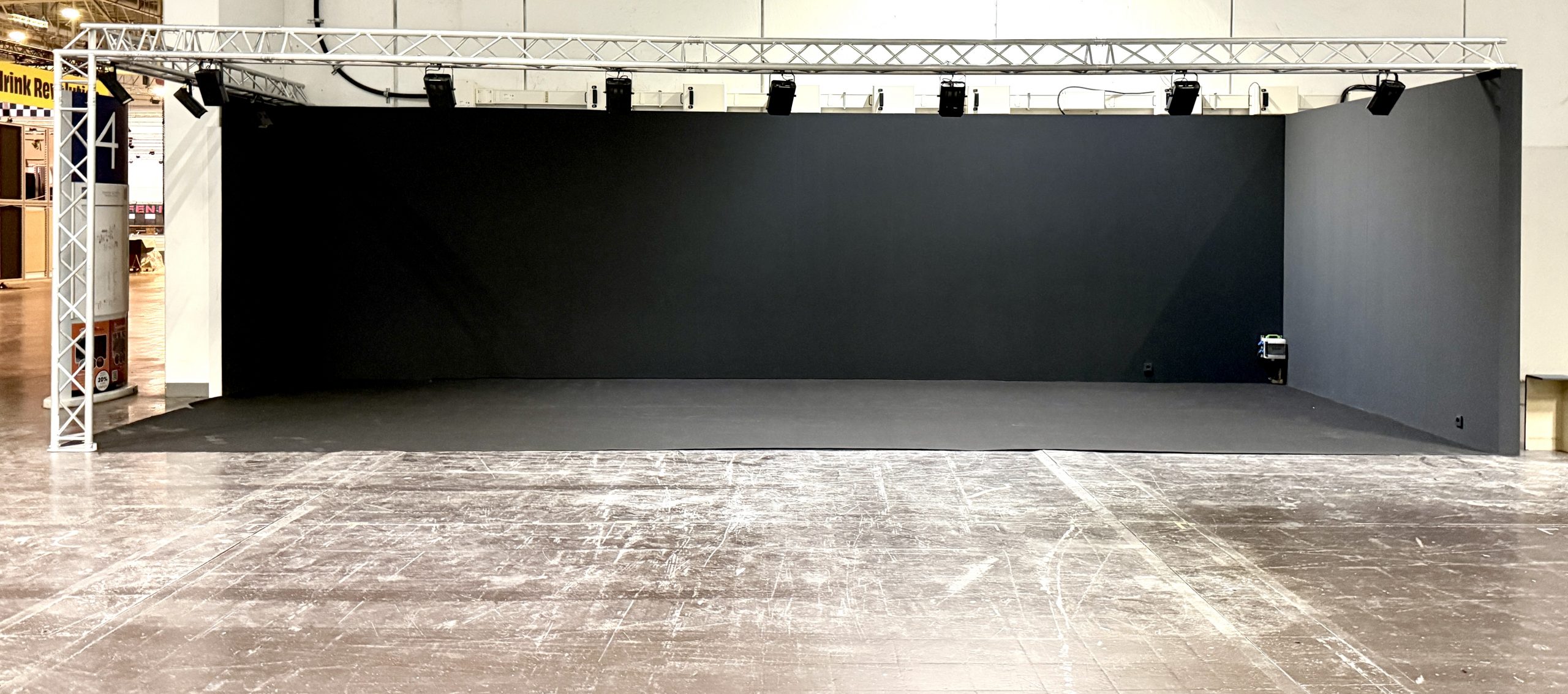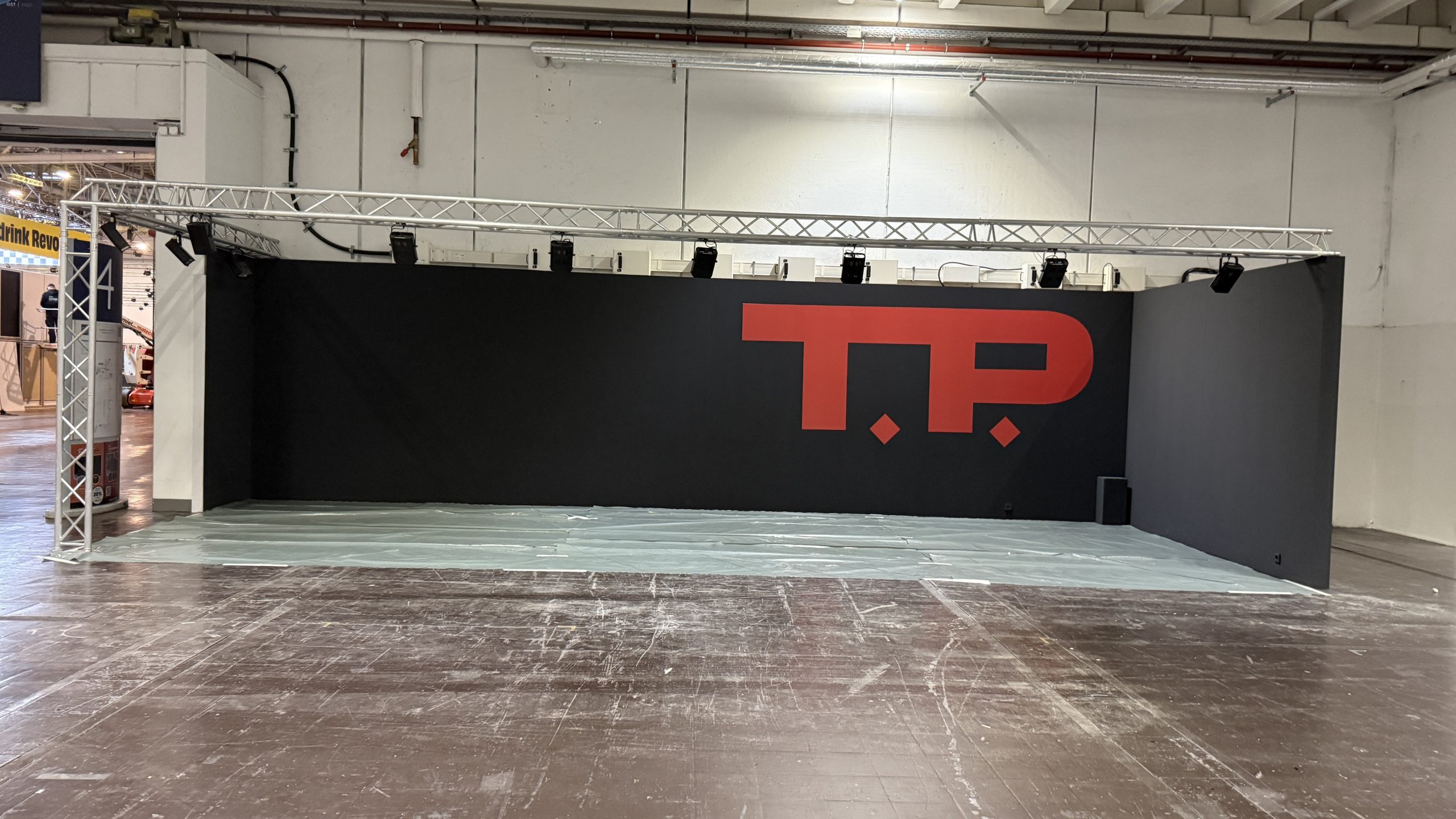 Unser Job: Wände bauen, Traversen mit Beleuchtung, Schwarzer Teppich.