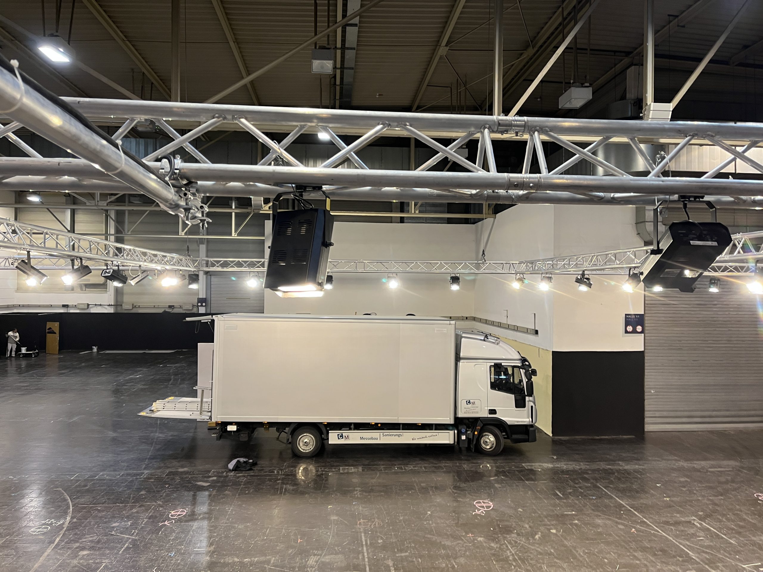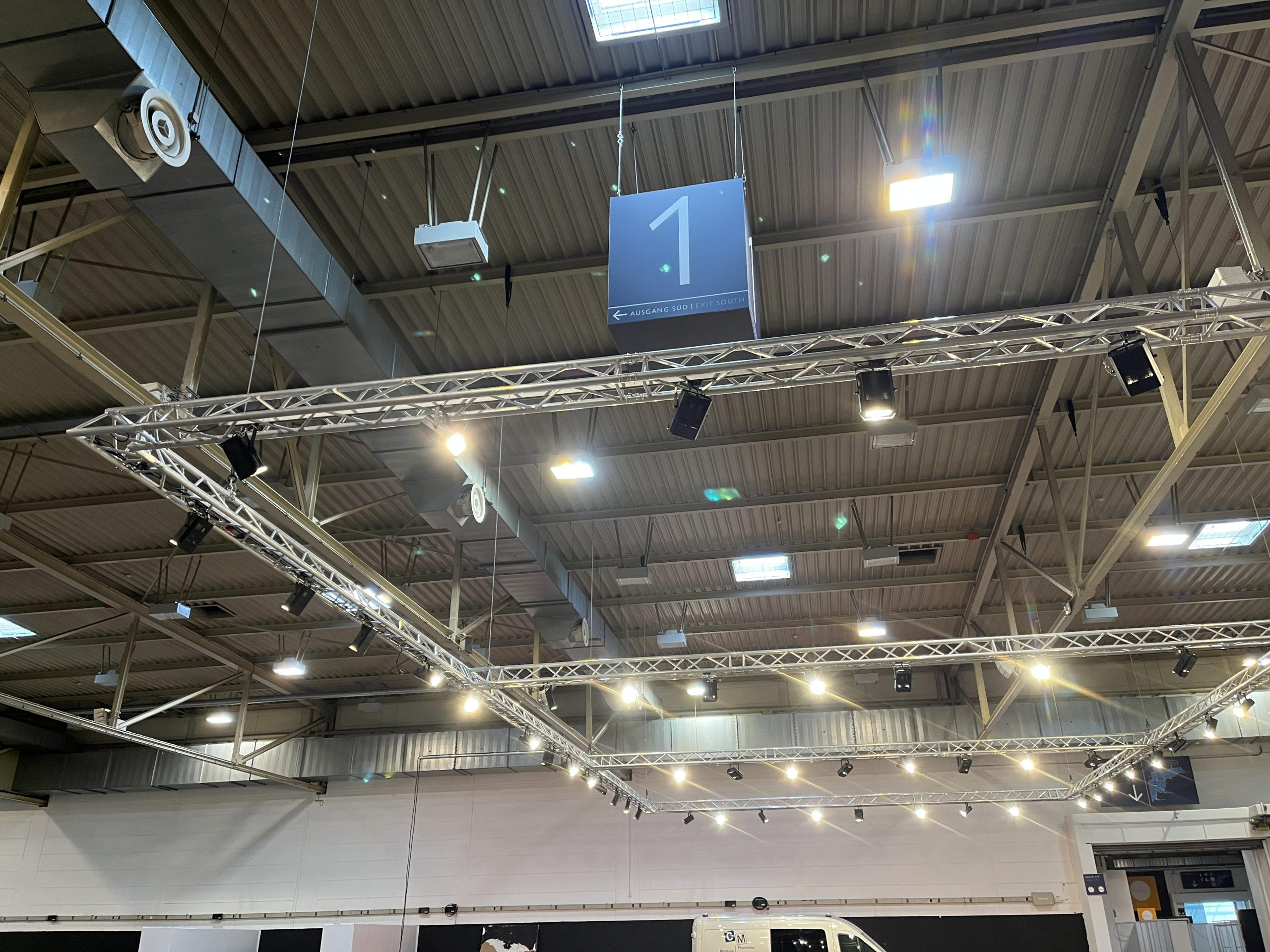 Beleuchtung: Die Beleuchtung auf Messen ist oft ein zentraler Bestandteil, um die Exponate gut in Szene zu setzen. Es werden LED-Scheinwerfer, Spotlights und manchmal auch dekorative Beleuchtungselemente eingesetzt. Das Beleuchtungssystem ist dann an der Truss Struktur montiert.
