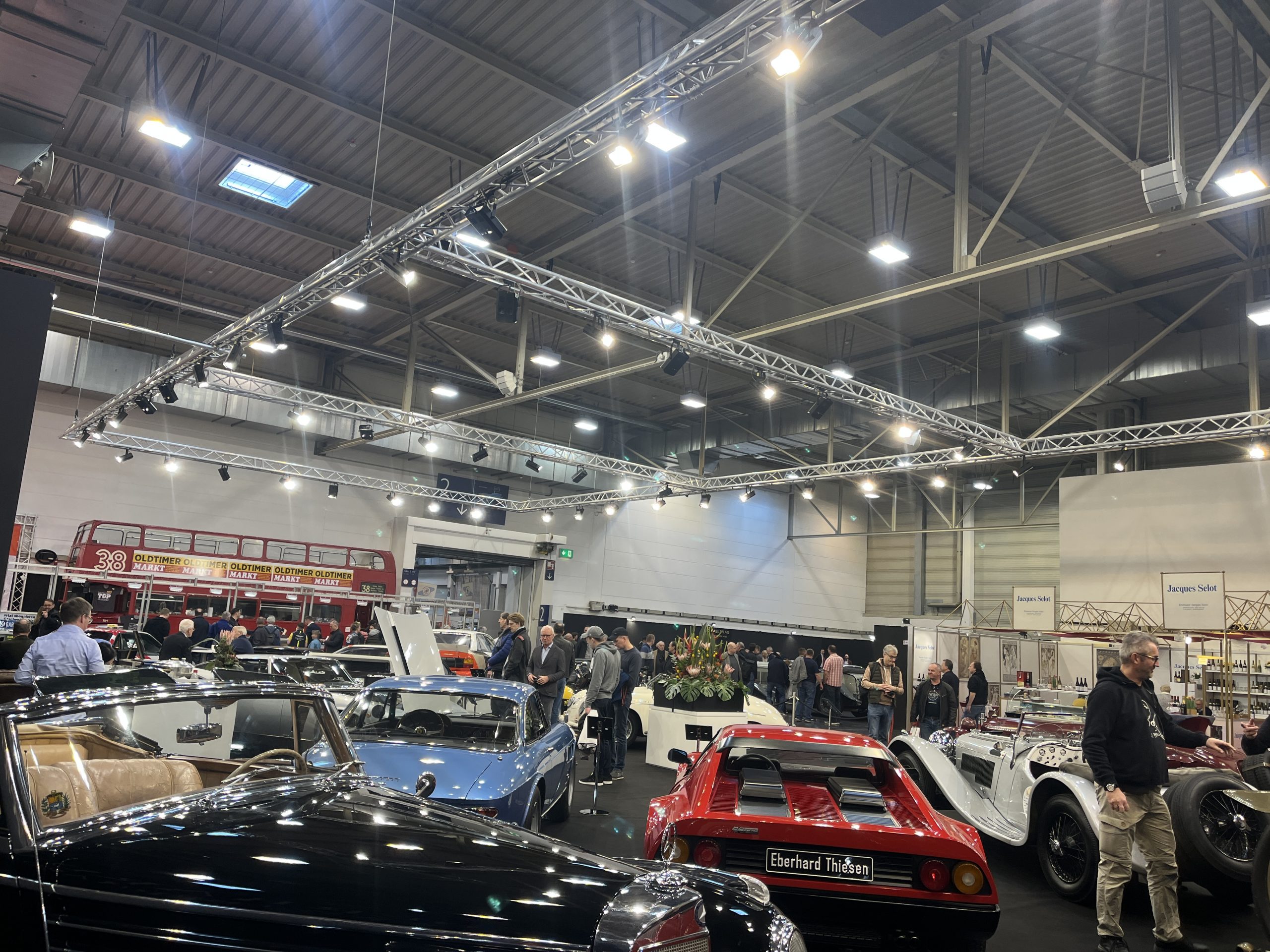 Messestandgestaltung: In einer Messe wie der Techno Classica wird das Traversensystem häufig genutzt, um zusätzliche visuelle Effekte zu erzeugen oder Markenlogos und Banner aufzuhängen.